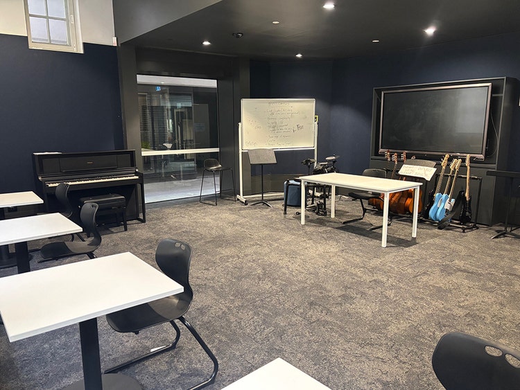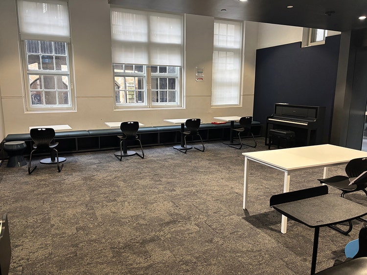 Large, carpeted study centre with 25 individual study desks & group seating. Hire conditional to furniture remaining unmoved.